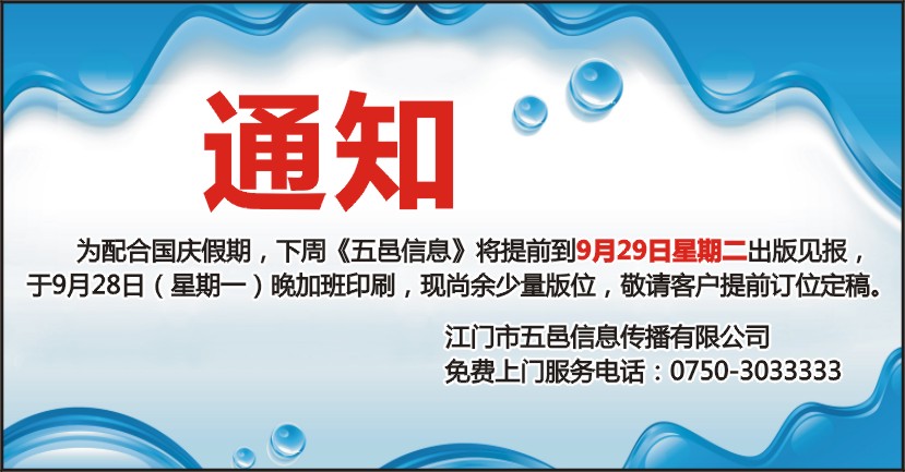 为配合国庆假期,下周《五邑信息》将提前到9月29日星期二出版见报,于9月28日(星期一)晚加班印刷,现尚余少量版位,敬请客户提前订位定稿。