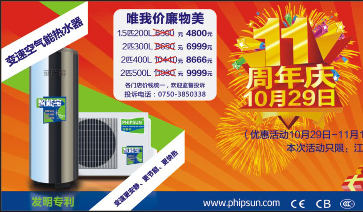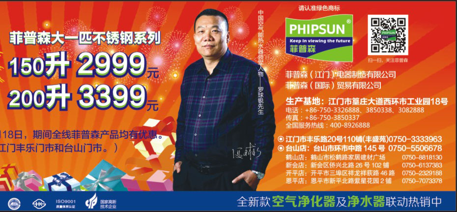 变速空气能热水器 变速更安静、更节能、更快热 唯我价廉物美 1.5匹200L 4800元 2匹300L 6999元 2匹400L 8666元 2匹500L 9999元 各门店价钱统一,欢迎监督投诉 投诉电话:0750-3850338 11周年庆10月29日 菲普森大一匹不锈钢系列 150升2999元 200升3399元 优惠活动10月29日-11月18日,期间全线菲普森产品均有优惠。 本次活动只限:江门丰乐门市和台山门市。 中国空气能热水器领军人物——罗球锐先生 www.phipsun.com 菲普森(江门)电器制造有限公司 菲普森(国际)贸易有限公司 生产基地:江门市篁庄大道西环市工业园18号 电话:+86-750-3326888、3850338、3082888 传真:+86-750-3850337 全国服务热线:400-8926888 江门市丰乐路20号110铺(丰盛苑) 0750-3333963 台山店:台山市环市中路145号 0750-5506678 鹤山店:鹤山市松鹤路家居建材广场 0750-8808130 新会店:新会区侨兴北路26号102铺 0750-6137383 开平店:开平市三埠区祥龙祥荻路46号 0750-2329188 恩平店:恩平市新平北路紫星花园2铺 0750-7073378 www.phipsun.com 全新款空气净化器及净水器联动热销中