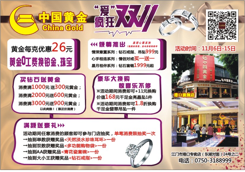 消费满1000元送300元黄金;
