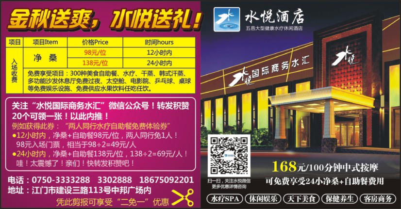 关注“水悦国际商务水汇”微信公众号!转发积赞20个可领一张!以此内推!