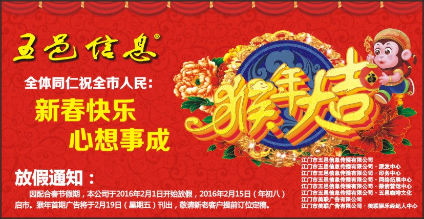 因配合春节假期,本公司于2016年2月1日开始放假,2016年2月15日(年初八)启市。猴年首期广告将于2月19日(星期五)刊出,敬请新老客户提前订位定稿。