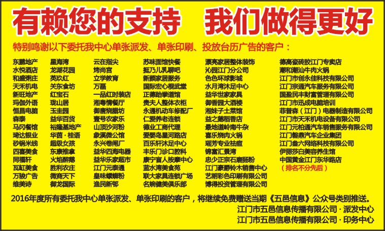 2016年度所有委托我中心单张派发、单张印刷的客户,将继续免费赠送当期《五邑信息》公众号类别推送。