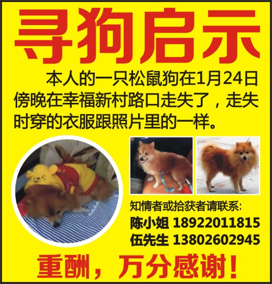 本人的一只松鼠狗在1月24日傍晚在幸福新村路口走失了,走失时穿的衣服跟照片里的一样。