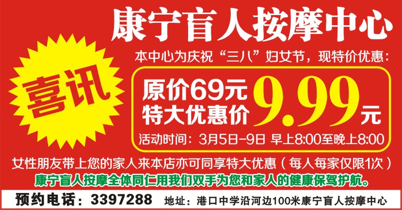 预约电话:3397288 地址:港口中学沿河边100米康宁盲人按摩中心