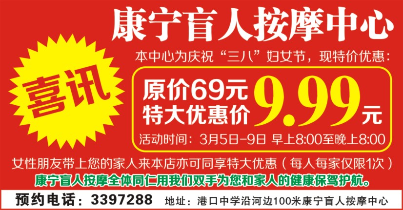 预约电话:3397288 地址:港口中学沿河边100米康宁盲人按摩中心