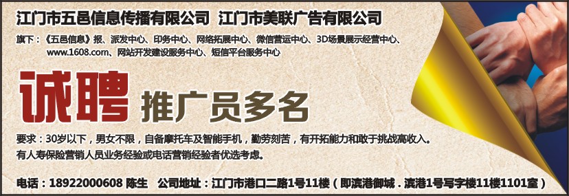 旗下:《五邑信息》报、派发中心、印务中心、网络拓展中心、微信营运中心、3D场景展示经营中心、www.1608.com、网站开发建设服务中心、短信平台服务中心