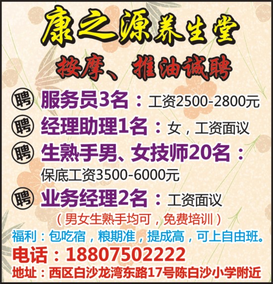 康之源养生堂 按摩、推油诚聘
