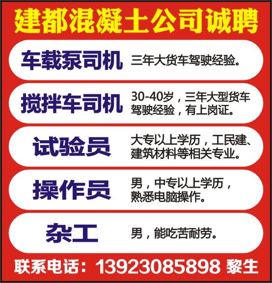 搅拌车司机:30-40岁,三年大型货车驾驶经验,有上岗证。