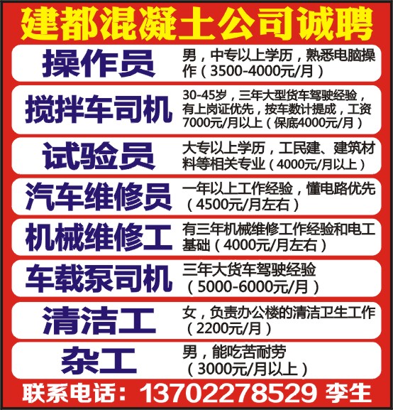 搅拌车司机:30-45岁,三年大型货车驾驶经验,有上岗证优先,按车数计提成,工资7000元/月以上(保底4000元/月)