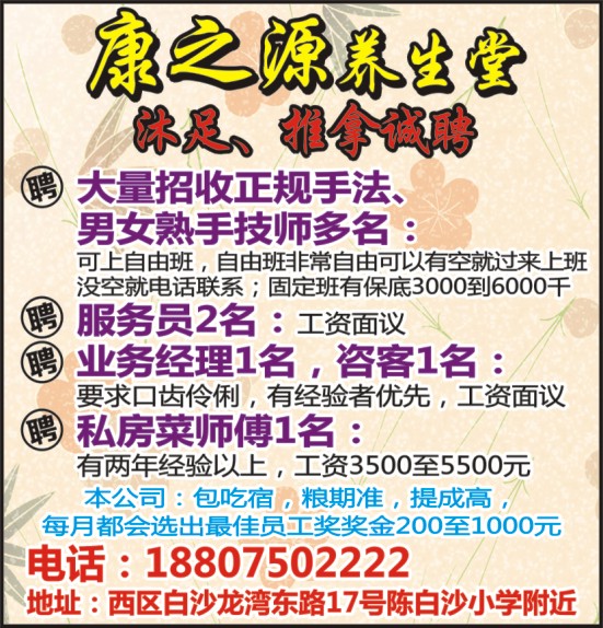 大量招收正规手法、男女熟手技师多名:可上自由班,自由班非常自由可以有空就过来上班没空就电话联系;固定班有保底3000到6000千