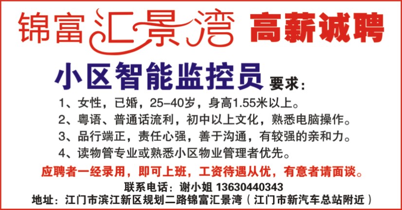 地址:江门市滨江新区规划二路锦富汇景湾(江门市新汽车总站附近)