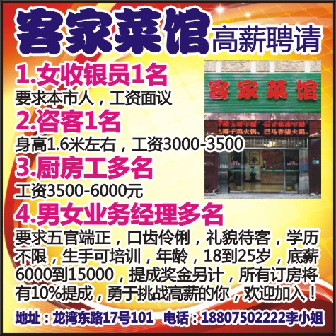 客家菜馆高薪聘请
