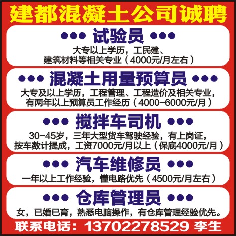 大专及以上学历,工程管理、工程造价及相关专业,有两年以上预算员工作经历(4000-6000元/月)