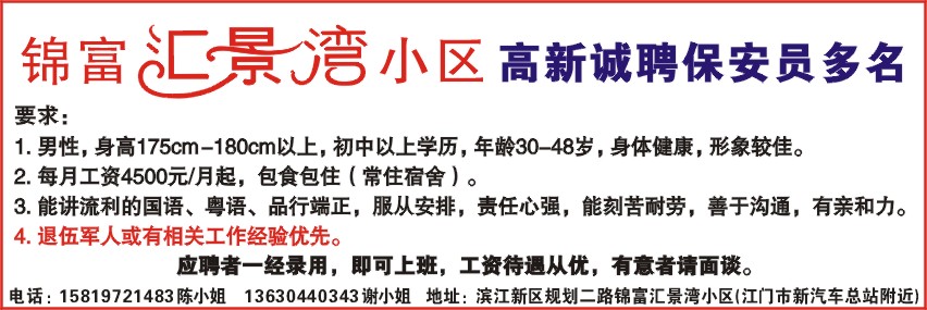 3. 能讲流利的国语、粤语、品行端正,服从安排,责任心强,能刻苦耐劳,善于沟通,有亲和力。