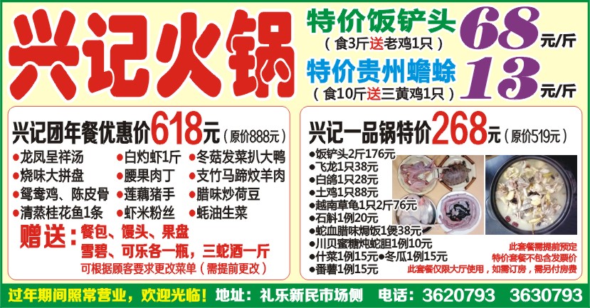 过年期间照常营业,欢迎光临!地址:礼乐新民市场侧 电话:3620793 3630793