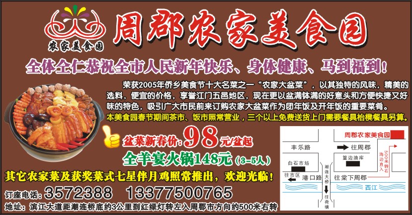 荣获2005年侨乡美食节十大名菜之一“农家大盆菜”,以其独特的风味,精美的选料,便宜的价格,享誉江门五邑地区,现在更以盆满钵满的好意头和方便快捷又好味的特色,吸引广大市民前来订购农家大盆菜作为团年饭及开年饭的重要菜肴。