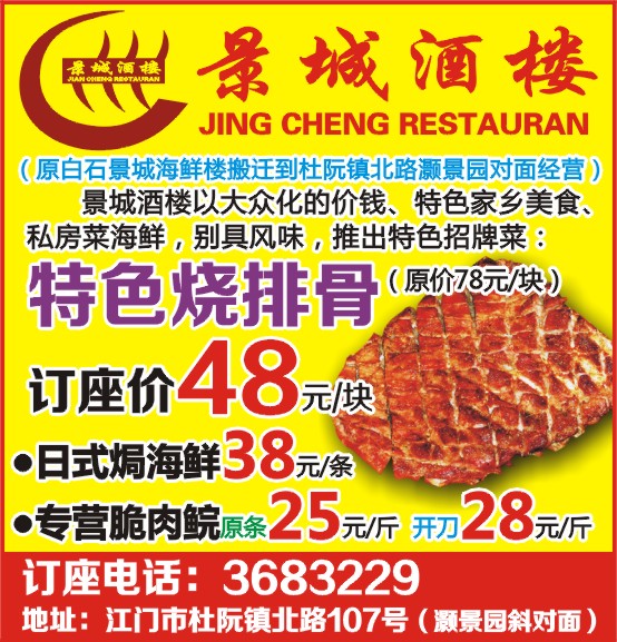(原白石景城海鲜楼搬迁到杜阮镇北路灏景园对面经营)