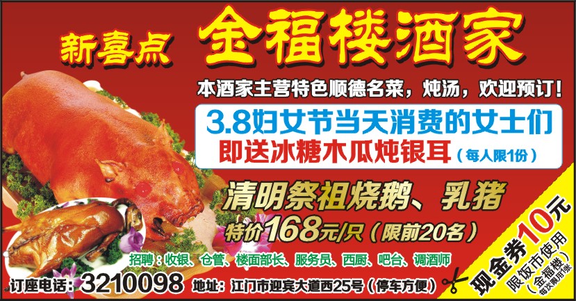 订座电话:3210098 地址:江门市迎宾大道西25号(停车方便)