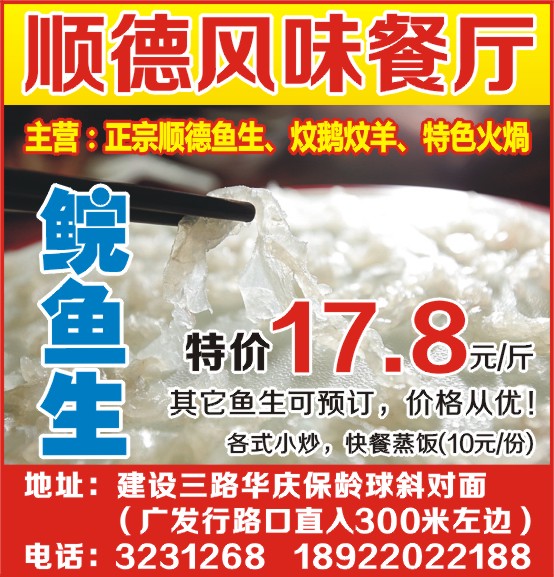 主营:正宗顺德鱼生、炆鹅炆羊、特色火煱