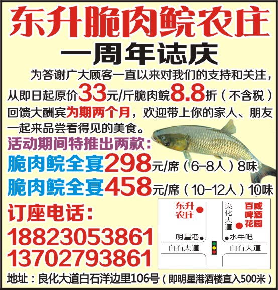 为答谢广大顾客一直以来对我们的支持和关注,从即日起原价33元/斤脆肉鲩8.8折(不含税)回馈大酬宾为期两个月,欢迎带上你的家人、朋友一起来品尝看得见的美食。