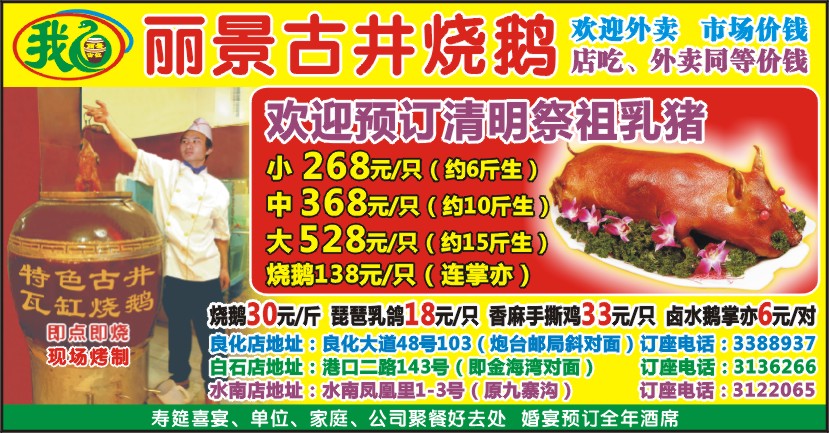 良化店地址:良化大道48号103(炮台邮局斜对面)订座电话:3388937