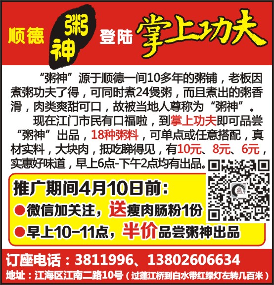 现在江门市民有口福啦,到掌上功夫即可品尝“粥神”出品,18种粥料,可单点或任意搭配,真材实料,大块肉,抵吃睇得见,有10元、8元、6元,实惠好味道,早上6点-下午2点均有出品。