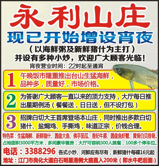 电话:3388296 各式小炒、河鲜应有尽有,新鲜猪什每碟16元起