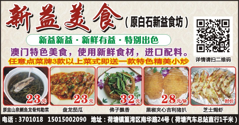 新益新益·新鲜有益·特别出色 澳门特色美食,使用新鲜食材,进口配料。 任意点菜牌3款以上菜式即送一款特色精美小炒 原盅山泉鲗鱼龙骨炖勒菜23元 盘龙茄瓜23元 佛子飘香32元 黑椒夹心吉利猪扒28元/块 芝士焗虾时价 电话:3701018 15015002090 地址:荷塘镇篁湾区南华路24号(荷塘汽车总站直行1千米)