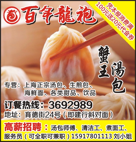 蟹王汤包 专营:上海正宗汤包、生煎包、海鲜面、各类甜品、饮品 凭本报消费满100元送20元代金券 订餐热线:3692989 地址:育德街24号(即建行斜对面) 高薪招聘:汤包师傅、清洁工、煮面工、服务员(可全职可兼职)15917801113 刘小姐