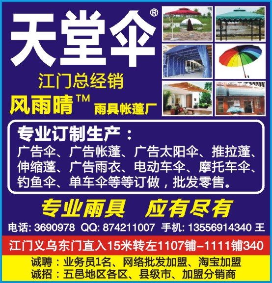广告伞、广告帐蓬、广告太阳伞、推拉蓬、伸缩蓬、广告雨衣、电动车伞、摩托车伞、钓鱼伞、单车伞等等订做,批发零售。
