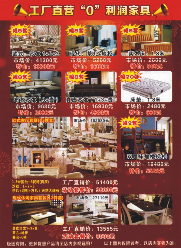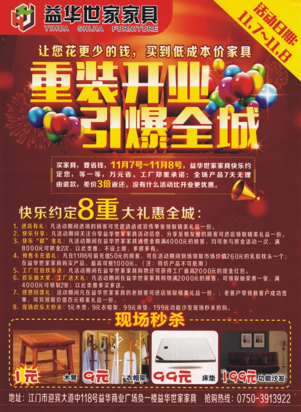 活动日期:11.7-11.8 让您花更少的钱,买到低成本价家具 重装开业 引爆全城 买家具,要省钱,11月7号-11月8号,益华世家家具快乐约定您,等一等,万元省。工厂郑重承诺:全场产品7天无理由退款,差价3倍返还。没有什么活动比开业更优惠。 快乐约定8重大礼惠全城: 1、进店有礼:凡活动期间进场的顾客可选邀请函或宣传单张领取精美礼品一份。 2、快乐分享:凡活动期间关注分享益华世家家具活动信息,分享至朋友圈的顾客可进店领取精美礼品一份。 3、快乐“献”金礼:凡活动期间在益华世家家具消费金额满4000元的顾客,均可参与抓金活动一次,满8000元可抓金2次,以此类推,不设上限,多抓多有。 4、预售卡充值礼:凡在11月6号前充值50元的顾客,可在活动期间到场领取市场价值260元的乳胶枕头一个;在益华世家家具购买产品,最高可抵1000元。(注:特价产品不可抵用) 5、工厂红包欢乐送:凡活动期间在益华世家家具购物还可获得工厂最高2000元的现金红包。 6、欢乐抽大奖、工厂送大礼:凡活动期间在益会世家家具购物满2000元的顾客,可领取抽奖券一张,满4000元可领取2张;以此类推多买多送。 7、感恩回馈礼:活动期间凡在益华世家家具的老顾客可进店售出领取精美礼品一份;老客户带领新客户成功签单,可另领取价值百元精美礼品一份。 8、现场欢乐大秒杀:1元木凳,9元衣帽架,99元床垫,199元功能沙发现场秒杀抢购。 工厂直营“0”利润家具 版图有限,更多优惠产品请至店内参观选购! 地址:江门市迎宾大道中118号益华商业广场负一楼益华世家家具 抢购热线:0750-3913922