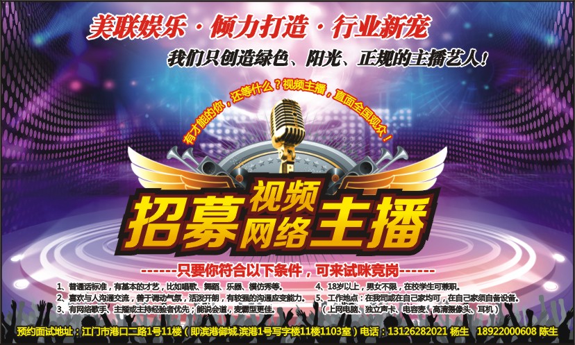 3、有网络歌手、主播或主持经验者优先;能说会道,麦霸型更佳。