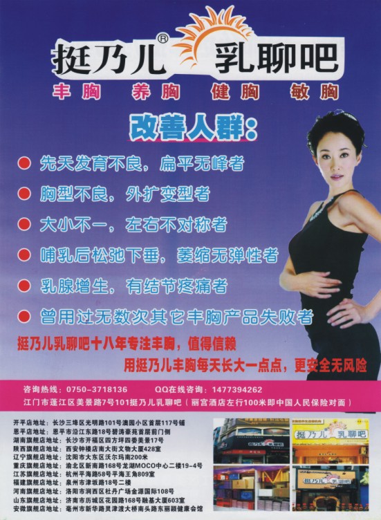 【挺乃儿乳聊吧】全球领先胸部养生连锁机构,成痒痒于2001年,全国七千多家连锁店面,一直致力于女性丰胸、养胸、健胸、美胸为核心,其以不打针、不吃药、不手术、不反弹、安全的丰胸效果得以万众女性的喜爱和信任。丰胸选择安全才是最关键。挺乃儿乳聊吧倡导女人爱乳房,爱自己。从平时就要做好乳房保养、日常护理和疾病预防让您在拥有美丽的同时,更拥有健康的生命。在这里我们将竭力为您服务!!!