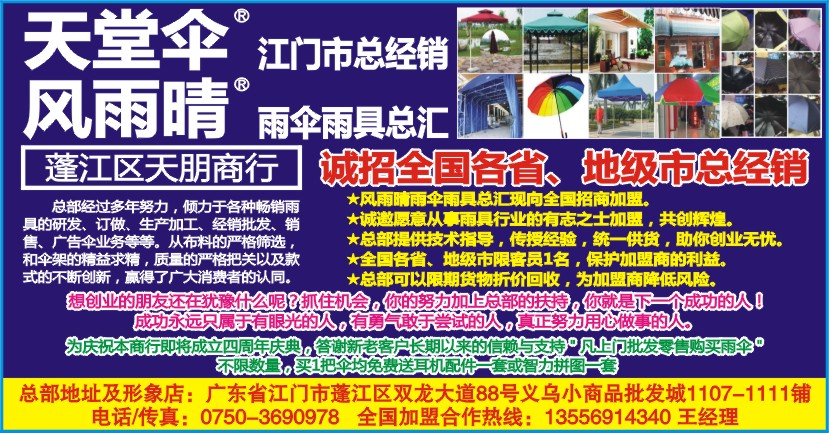 ★诚邀愿意从事雨具行业的有志之士加盟,共创辉煌。