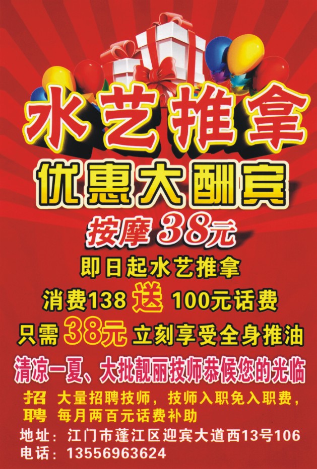 即日起水艺推拿消费138送100元话费
