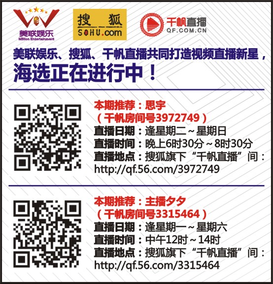 本期推荐:思宇(千帆房间号3972749) 直播日期:逢星期二~星期日 直播时间:晚上6时30分~8时30分 直播地点:搜狐旗下“千帆直播”间: http://qf.56.com/3972749