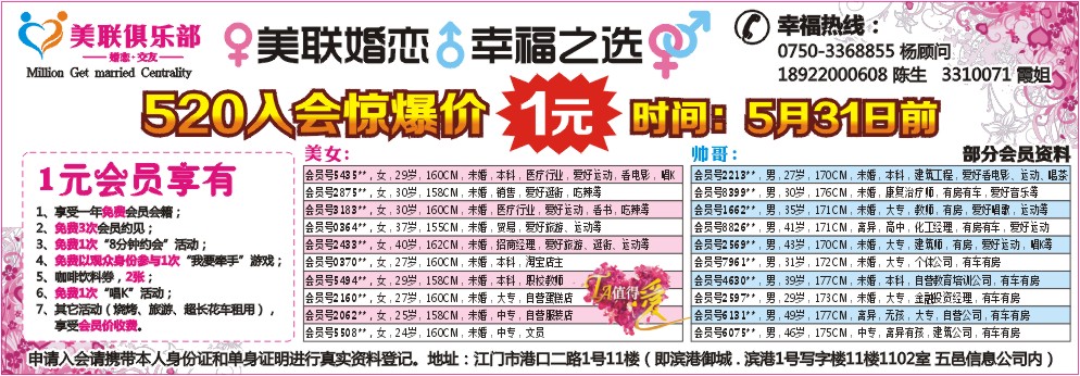 申请入会请携带本人身份证和单身证明进行真实资料登记。地址:江门市港口二路1号11楼(即滨港御城 . 滨港1号写字楼11楼1102室 五邑信息公司内)