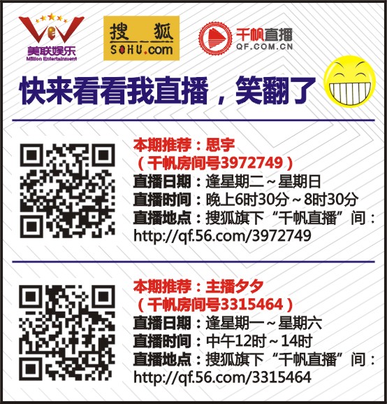 本期推荐:思宇(千帆房间号3972749) 直播日期:逢星期二~星期日 直播时间:晚上6时30分~8时30分 直播地点:搜狐旗下“千帆直播”间: http://qf.56.com/3972749