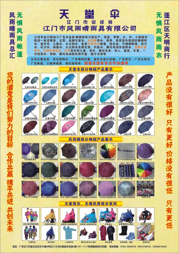 公司专业订制加工广告伞业务,畅销雨具订制生产、批发、零售,大、中、小型超市配送一条龙服务,主营:品牌天堂伞、风雨晴雨伞、雨具、各款高中低档欣叠晴雨伞、直杆伞、儿童伞、大太阳伞,各款无惧风雨帐蓬、铝合金、不锈钢帐蓬、四方伞、长方伞、斜面伞、大太阳伞及撑支架,钓鱼伞、摩托电动车遮阳伞,品牌天堂雨衣,无惧风雨雨衣,亿美雨衣等儿童、单车、摩托车单、双人、套装,车罩,一次性雨衣、雨鞋、摩托电动防风雨手套、帽子伞等等