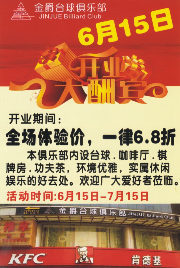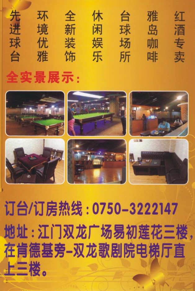 本俱乐部内设台球 . 咖啡厅 . 棋牌房 . 功夫茶,环境优雅,实属休闲娱乐的好去处。欢迎广大爱好者莅临。