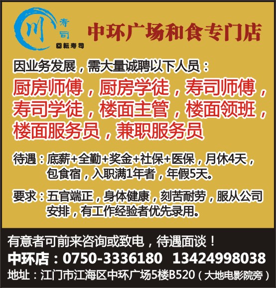 厨房师傅,厨房学徒,寿司师傅,寿司学徒,楼面主管,楼面领班,楼面服务员,兼职服务员
