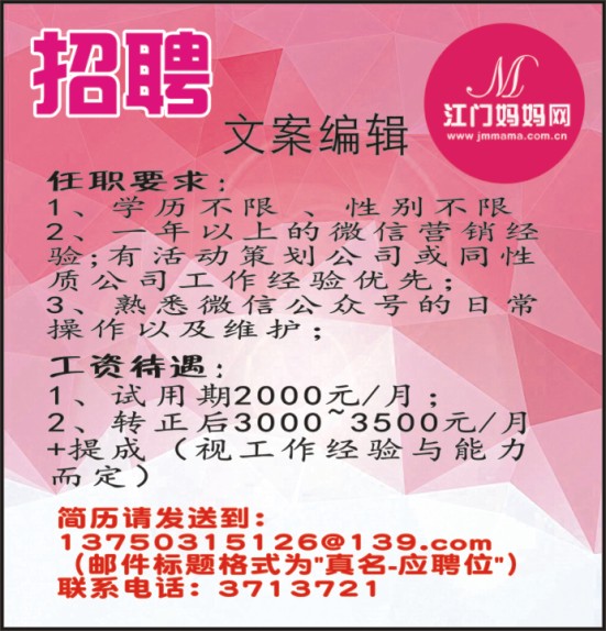 2、一年以上的微信营销经验;有活动策划公司或同性质公司工作经验优先;