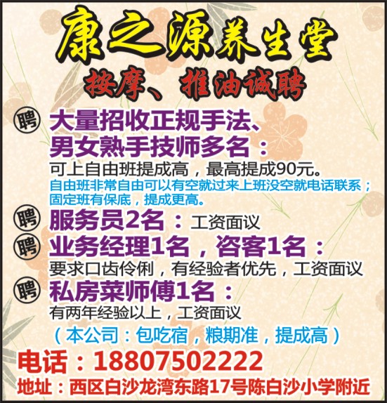 大量招收正规手法、男女熟手技师多名:可上自由班提成高,最高提成90元。