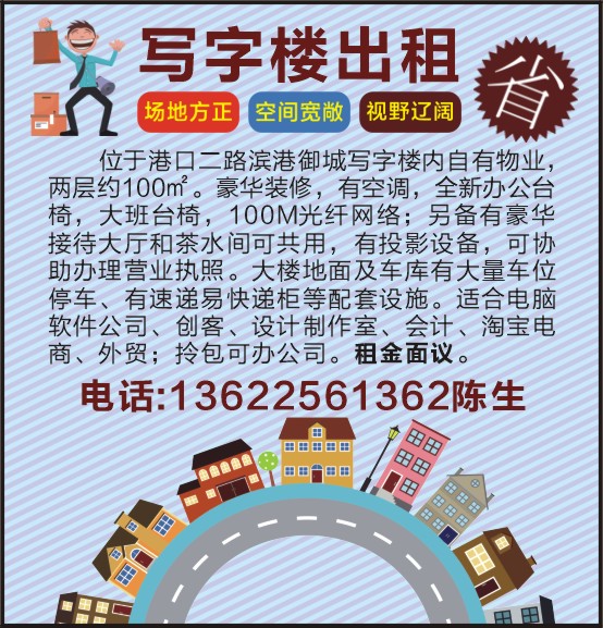 位于港口二路滨港御城写字楼内自有物业,两层约100㎡。豪华装修,有空调,全新办公台椅,大班台椅,00M光纤网络;另备有豪华接待大厅和茶水间可共用,有投影设备,可协助办理营业执照。大楼地面及车库有大量车位停车、有速递易快递柜等配套设施。适合电脑软件公司、创客、设计制作室、会计、淘宝电商、外贸;拎包可办公司。租金面议。