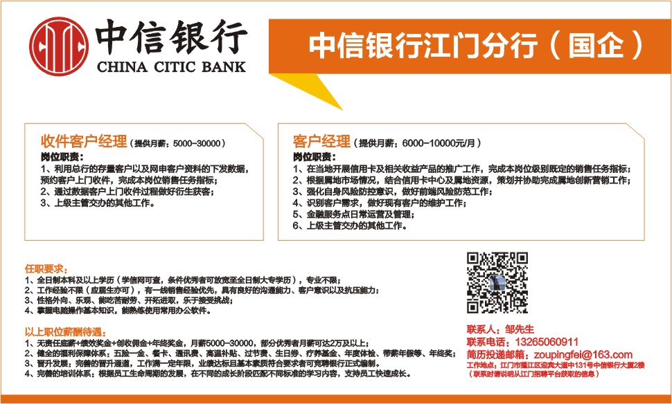 工作地点:江门市蓬江区迎宾大道中131号中信银行大厦2楼