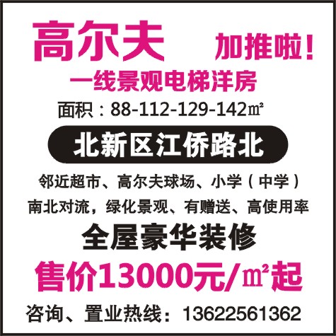 一线景观电梯洋房 面积:88-112-129-142㎡ 北新区江侨路北 邻近超市、高尔夫球场、小学(中学) 南北对流,绿化景观、有赠送、高使用率 全屋豪华装修 售价13000元/㎡起 咨询、置业热线:13622561362
